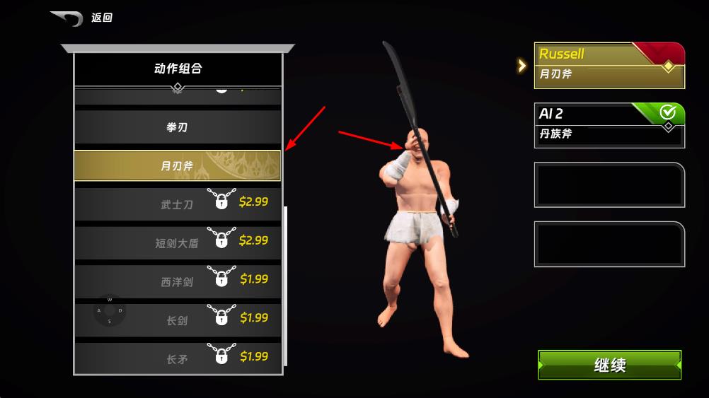 1、在武器选择界面,挑选月刃斧等动作组合武器,选定后点击继续,进入格斗场景,为战斗做好准备。