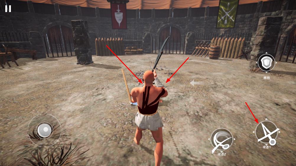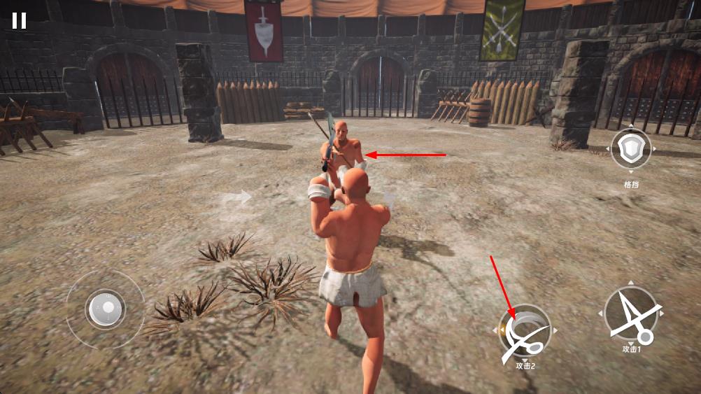 2、在格斗场景中,利用攻击1攻击2按钮发起进攻,同时点击格挡按钮防御敌人攻击,灵活操作与对手交锋。
