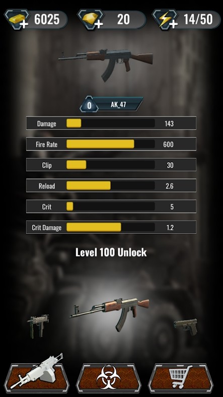 1、武器与人物双升级强化战力:支持通过升级提升武器的射击间隔、弹夹大小、填装速度,让枪械在应对僵尸围攻时更高效;人物升级过程中还有机会解锁全新枪械。