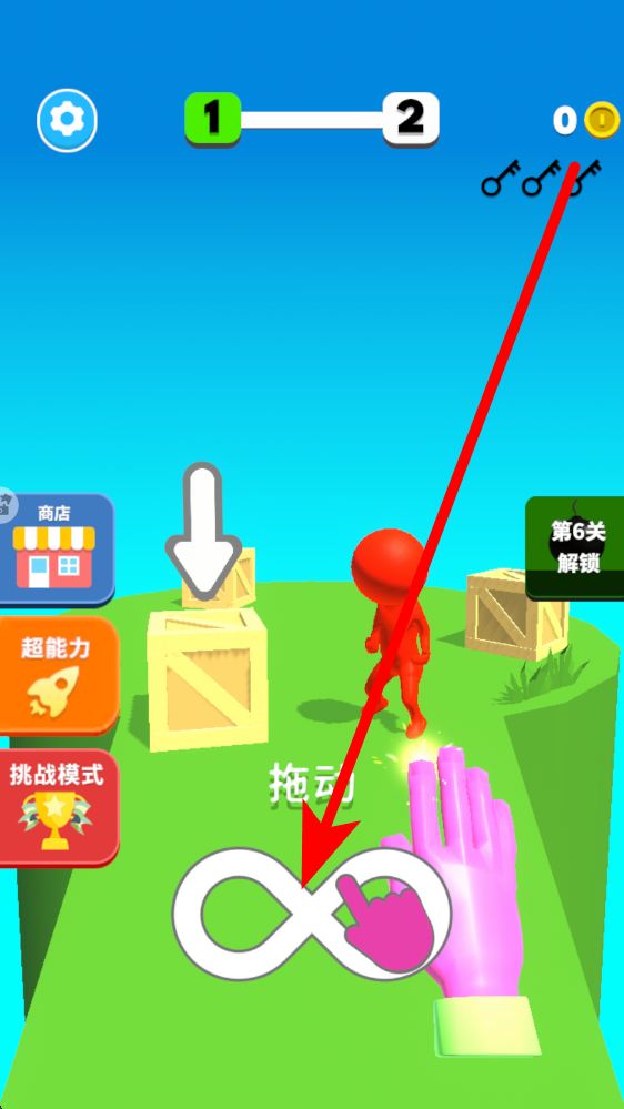 1、进入游戏关卡后,看到屏幕上的无限符号标志,按照提示拖动手指,以此操控游戏中的特殊能力,为后续突破障碍做好准备。