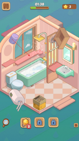 2、根据浴室布局和需求,将获取的道具如置物架、水桶等放置到合适位置,每成功放置合理物品可获一颗星星。