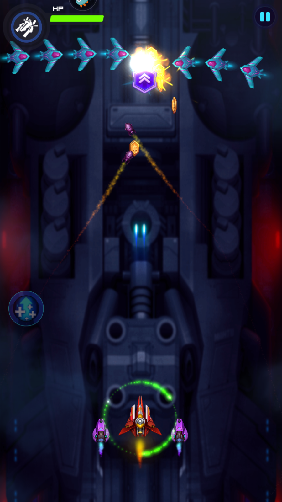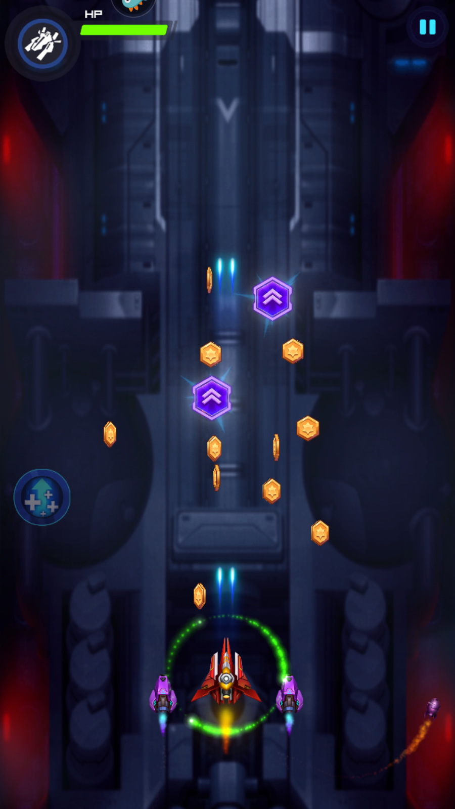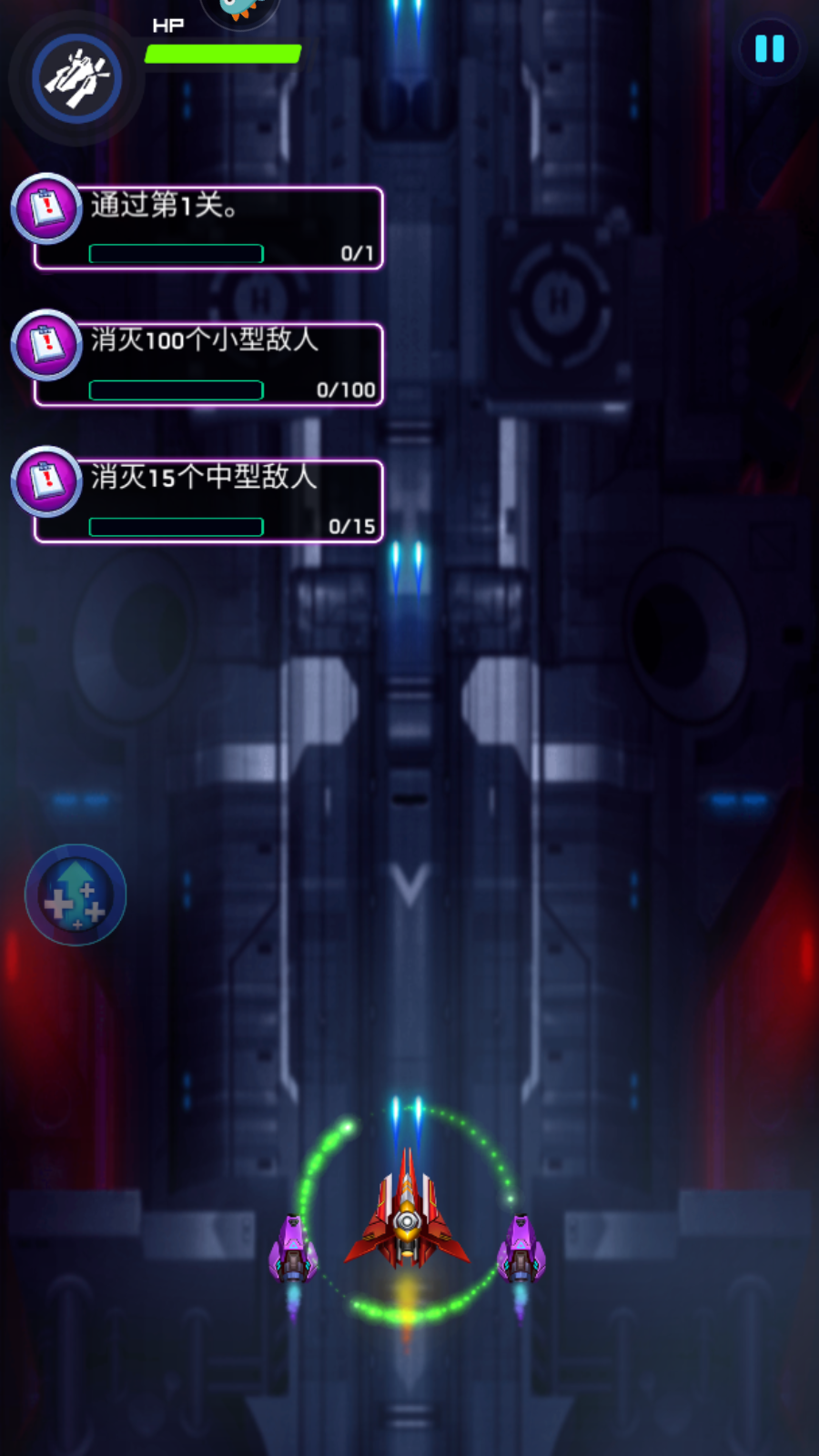 1、进入游戏,通过滑动屏幕操控己方红色主战机移动,注意屏幕左上角HP的生命值条,确保战机安全。