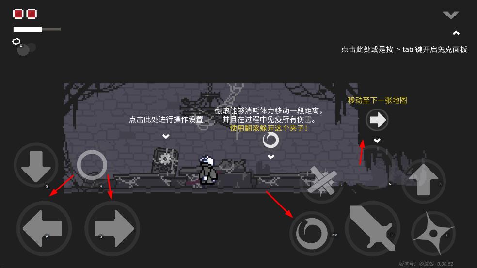 1、用方向键控制角色移动,可点击翻滚按键快速移动一段距离,过程中免疫所有伤害,还能切换至下一张地图探索。