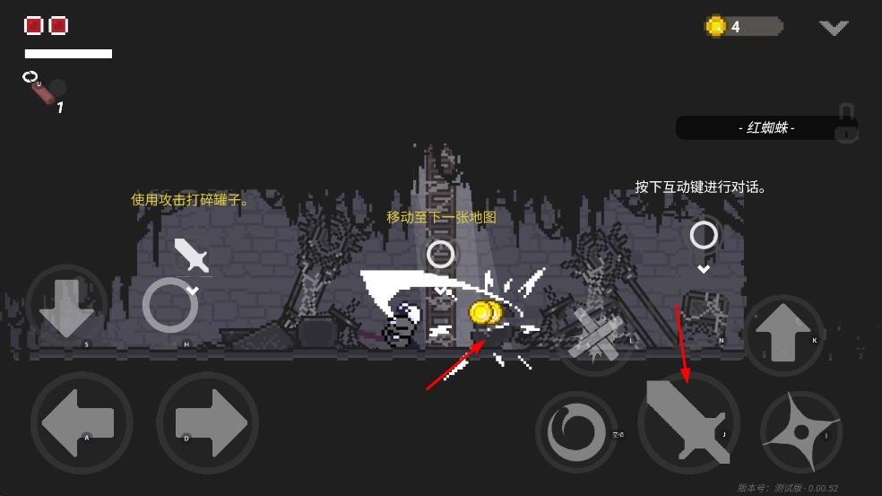 2、点击攻击键可打碎罐子获取道具,遇到敌人时,能发动攻击,也可按住格挡键抵挡敌人进攻,还能切换暗器作战。