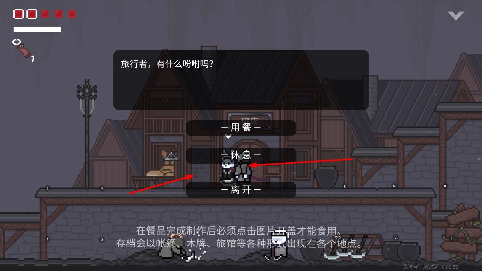 3、与NPC对话,在旅馆等场景可选择用餐,休息或离开;餐品制作完成后需点击图片开盖才能食用,存档会各种形式出现在不同地点。