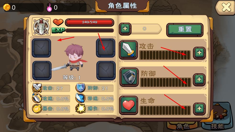 1、进入角色属性界面,可查看攻击、防御、生命等属性,点击属性旁的+按钮提升属性,增强角色战力,为冒险做好准备。