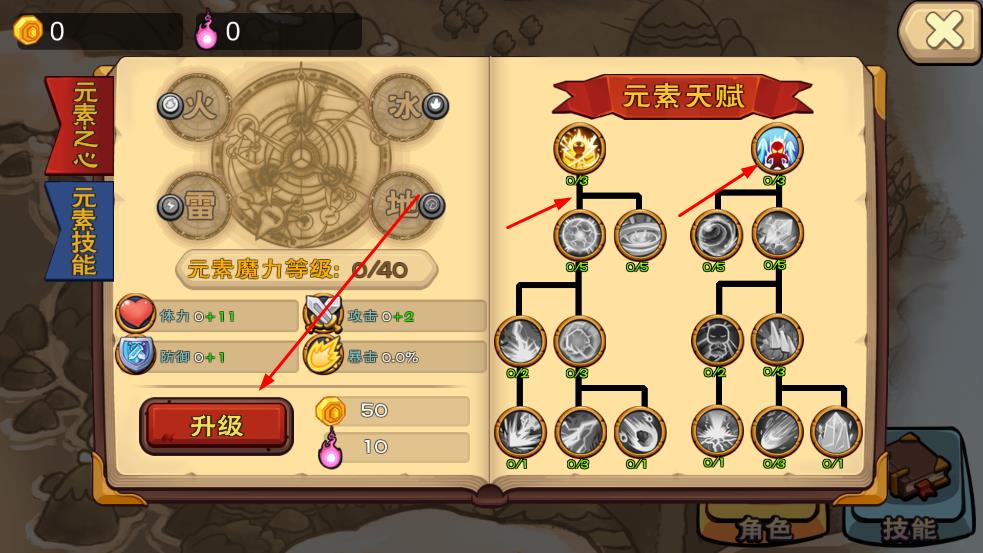 2、在元素天赋界面,消耗金币和道具点击升级,提升元素魔力等级,解锁更强大的元素天赋技能,助力战斗。