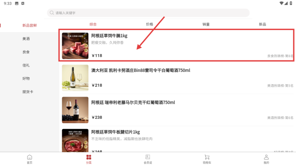 2、在分类页面,找到阿根廷草饲牛腩1kg商品条目,点击进入产品详情页。