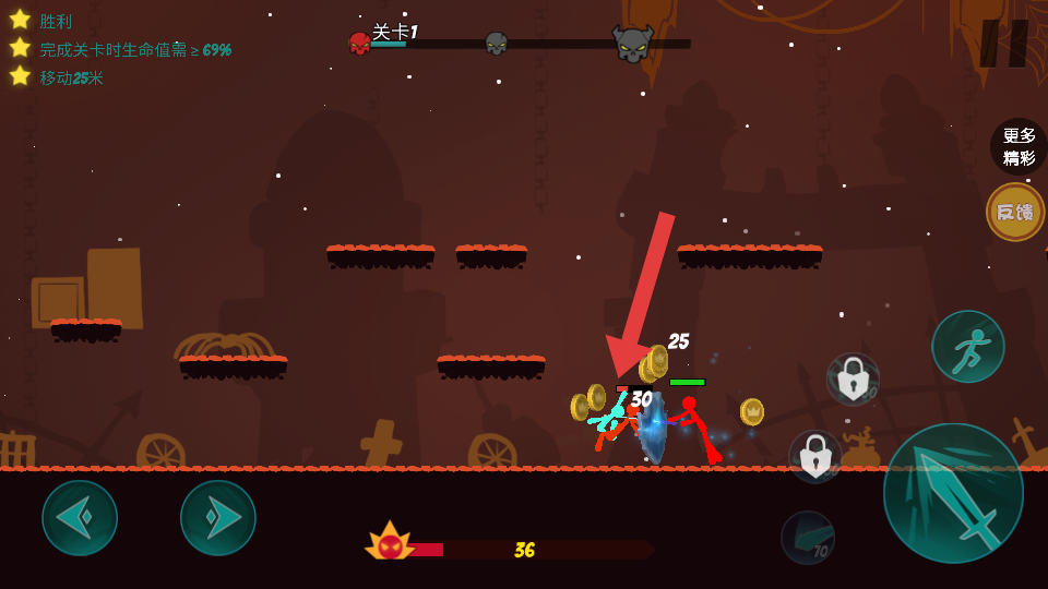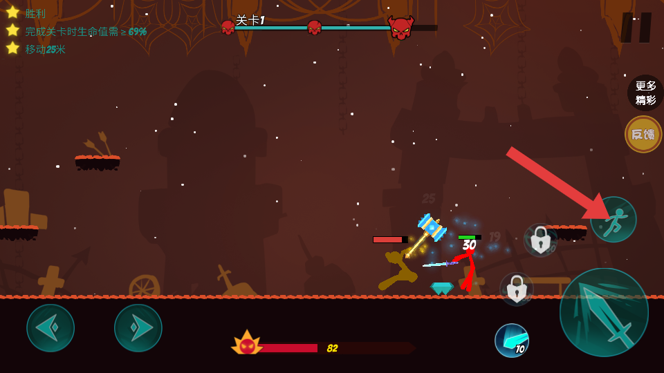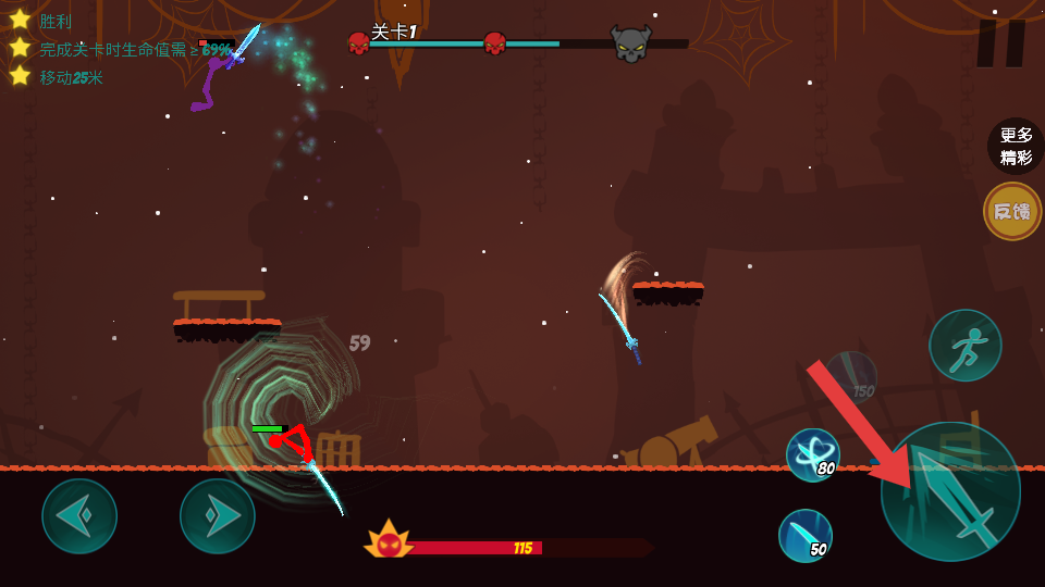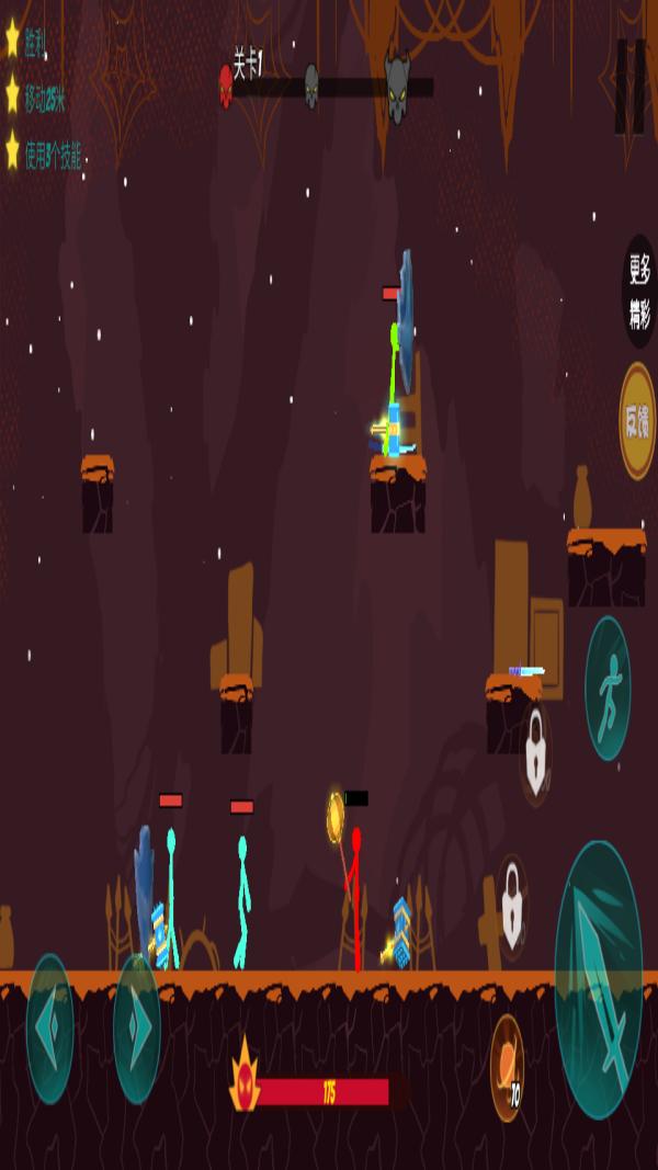2、手指操控释放连招:用手指精准控制火柴人动作,通过“点击普攻+滑动释放技能”的组合,触发专属连招,比如连续的点击后上滑释放大招,最大化的输出伤害。