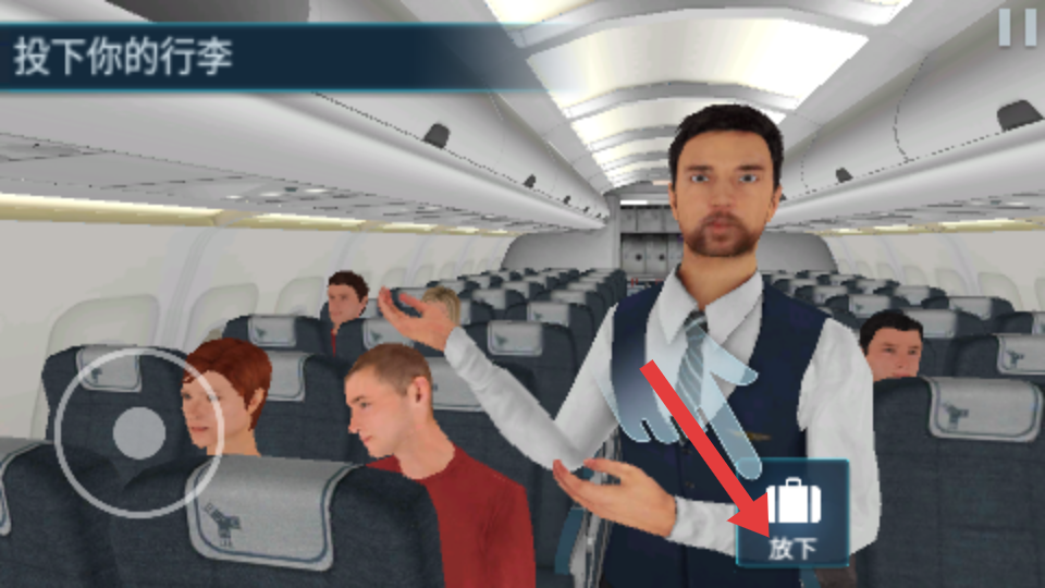 2、先点击角色身旁的行李图标,可将行李放置,在座位上方行李架或座位的下方,确保完成乘机的基础的步骤。