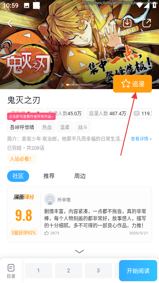 3、在漫画详情页,点击追漫按钮,可将该漫画加入书架。