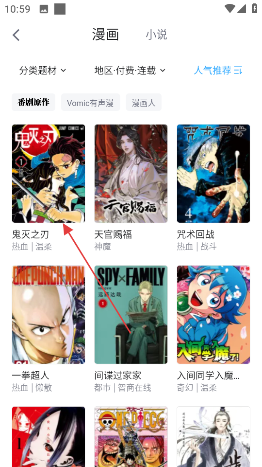 2、在分类页面的漫画列表里,找到喜欢的漫画,比如鬼灭之刃,点击进入其详情页。