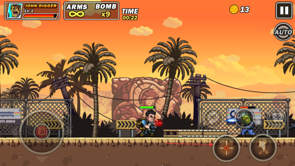 1、进入游戏查看左上角角色信息JOHN DIGGER,用左下方虚拟摇杆控制角色移动,躲避敌人攻击。