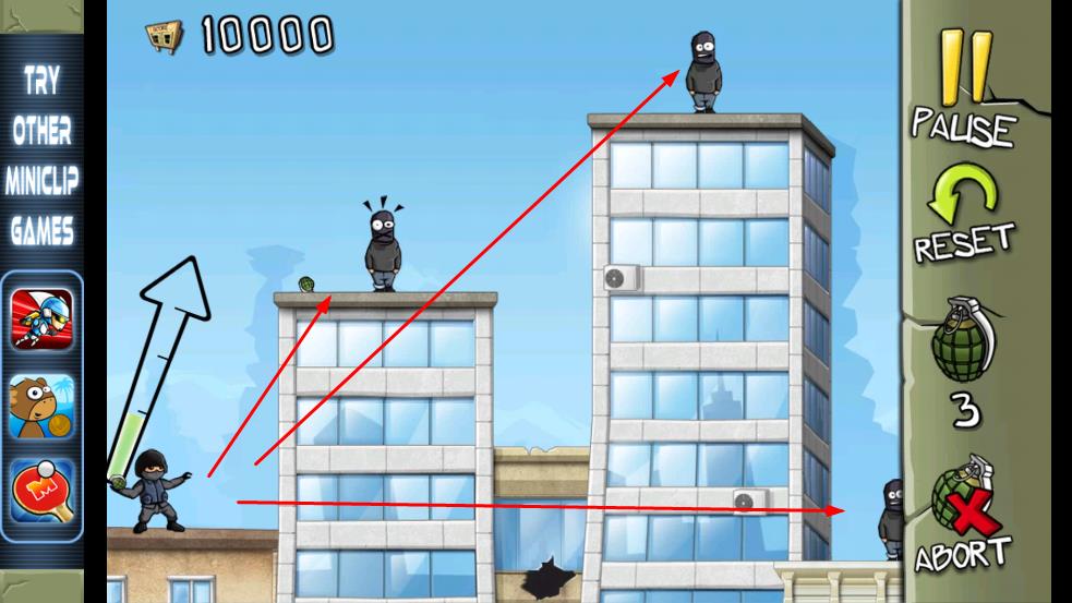 3、面对不同高度的建筑目标,调整投掷轨迹,击中高处敌人,挑战更复杂的投掷场景。