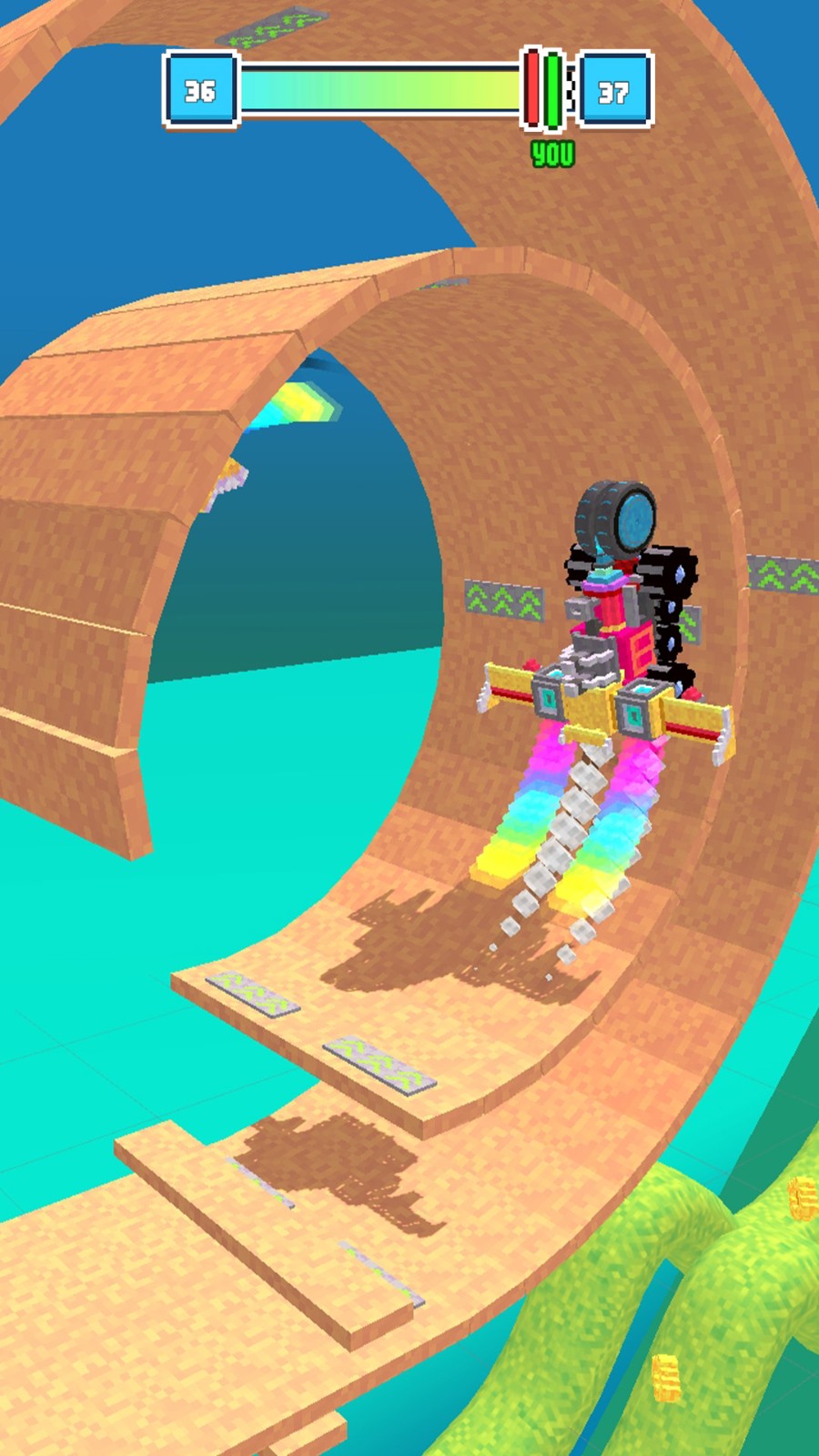 2、在赛道行驶过程中,通过踩脚踏板的操作来驱动飞车前进,控制飞车的速度与方向,躲避赛道上的障碍,朝着终点方向行进。