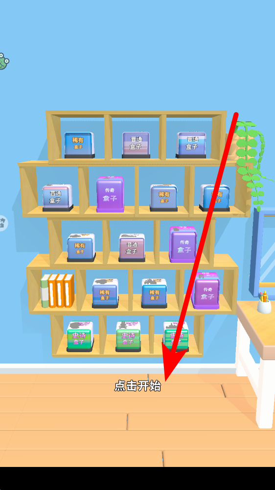 1、点击开始,进入游戏界面,此时会看到摆满各类盒子的架子,根据喜好或需求,挑选想要开启的盒子,为后续撕纸做准备。