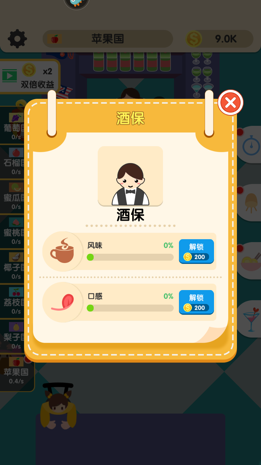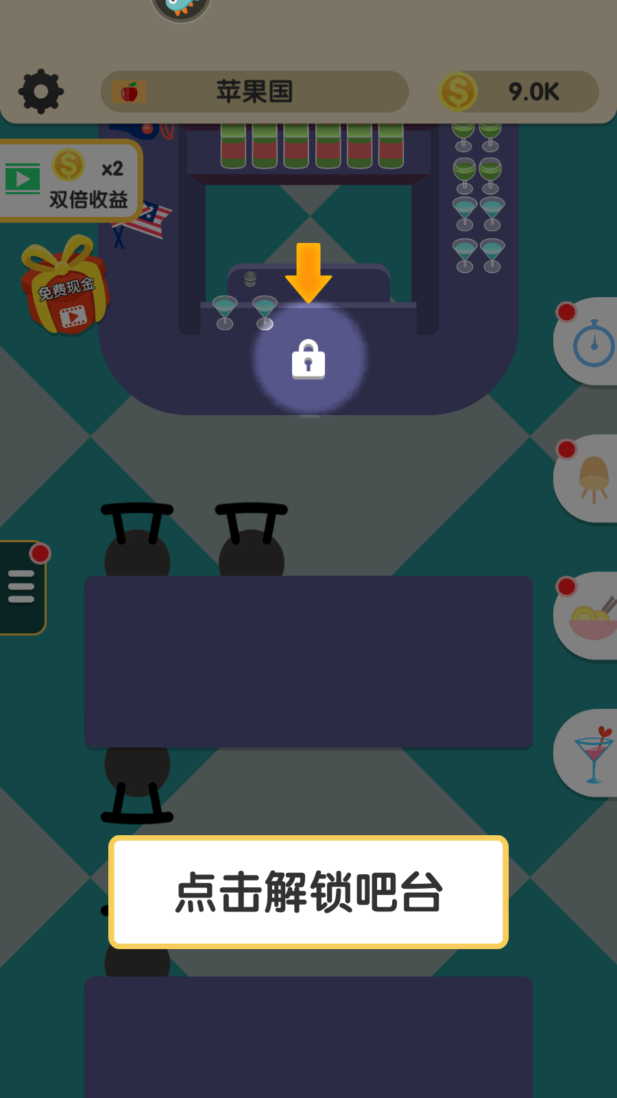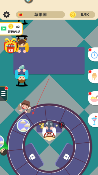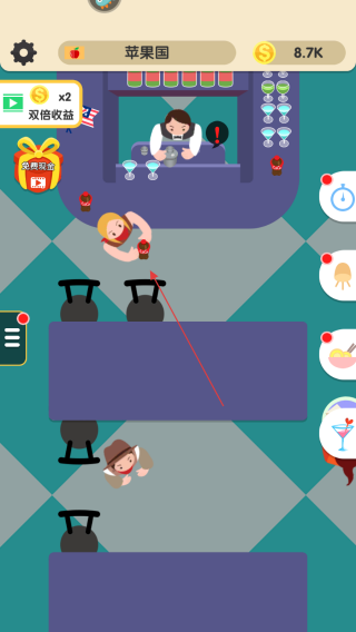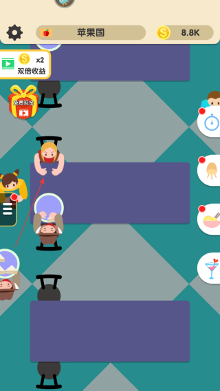 1、进入游戏,查看屏幕上方苹果国及金币数量,点击双倍收益获取更多金币。