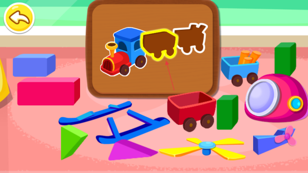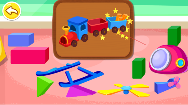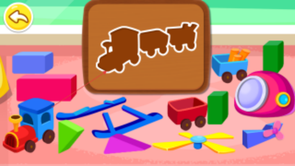 1、进入游戏,观察木板上显示的火车轮廓图案,找到场景中对应的玩具部件。