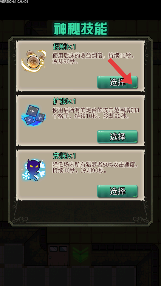 1、在神秘的技能界面,通过消耗游戏内获取的资源,对招财的等级,扩张以及安抚等技能进行升级。