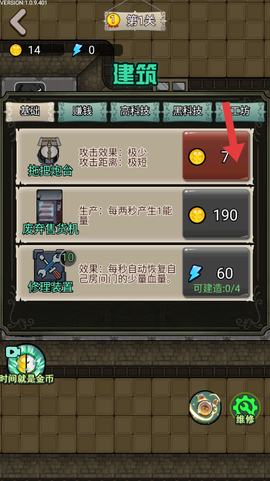 3、使用金币或能量等资源,对“拖把炮台”“废弃售货机”“修理装置”等建筑进行升级,升级拖把的炮台。