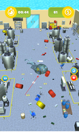 1、进入游戏,查看屏幕上方00:44的倒计时和金币数量81$,操控果冻怪兽在工厂场景移动。