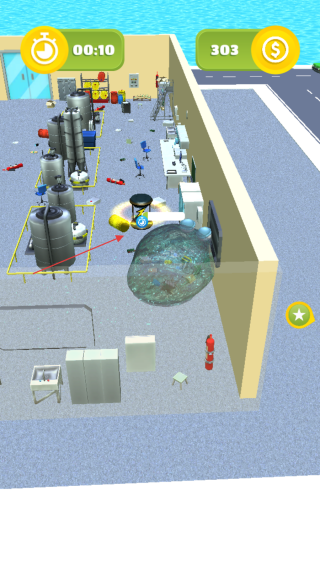 2、在场景中收集如红色油桶、蓝色箱子等物品,获取金币和资源,注意躲避障碍物。