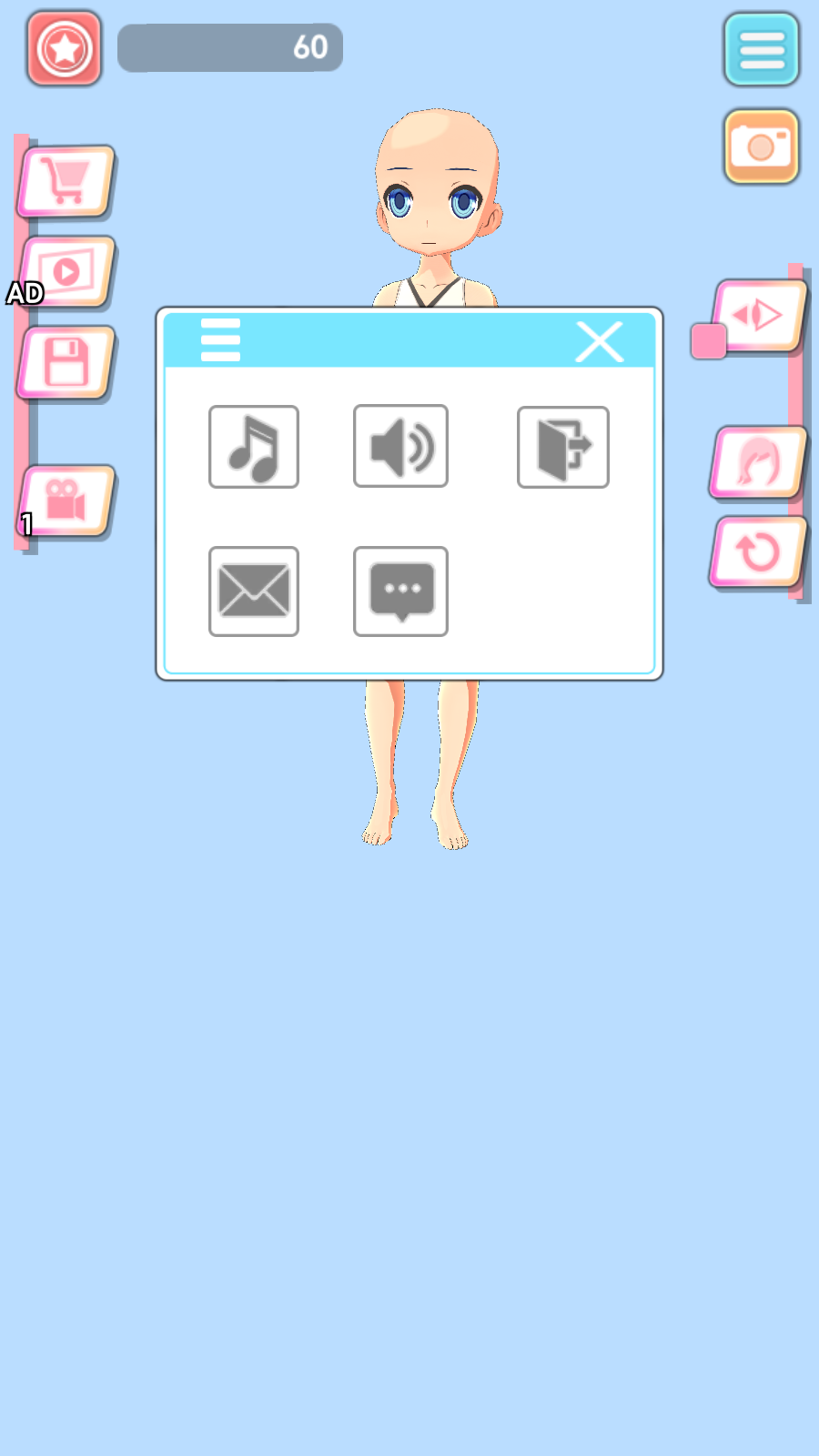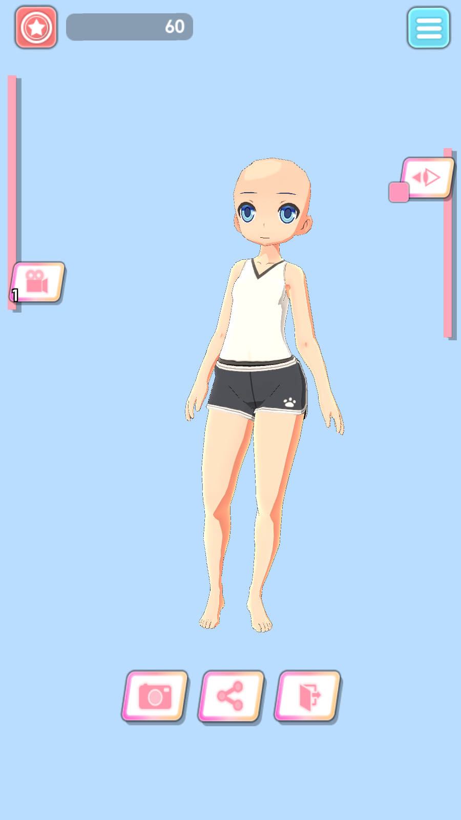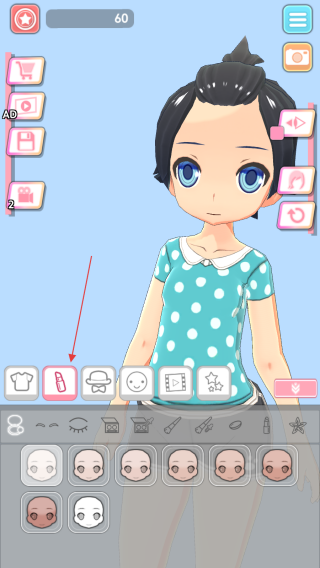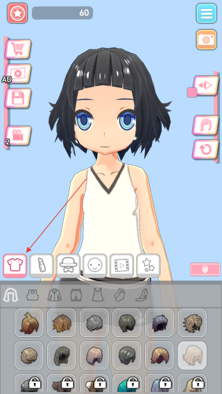1、进入游戏,查看屏幕上方数值60,点击下方图标栏中衣服图标,选择白色背心为角色穿搭。