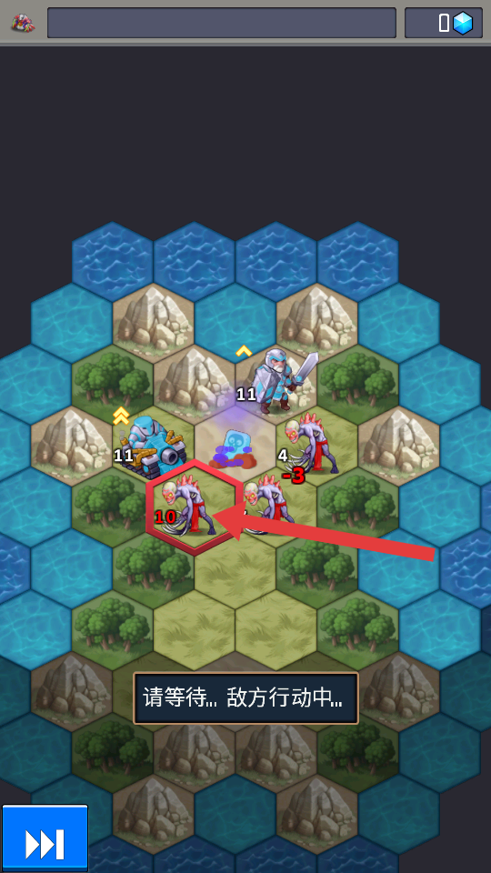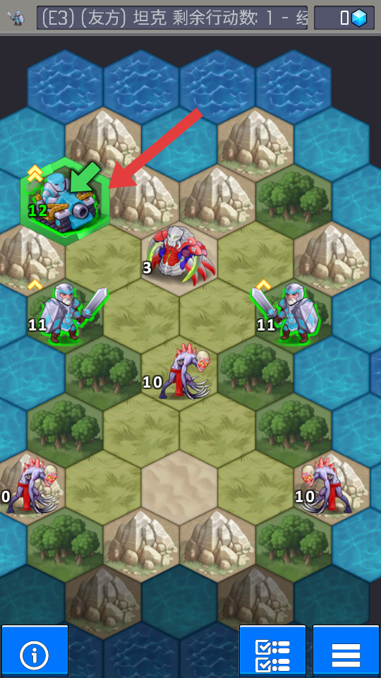 1、进入六边形网格战场后,先观察友方坦克、士兵的初始位置与敌方巨钳兽的分布,优先将坦克布置在前线。