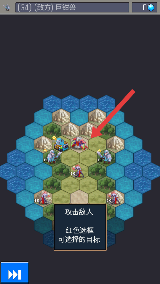 2、战斗操作技巧,根据红色选框可选择的目标提示,精准锁定敌方巨钳兽,优先攻击敌方防御较弱的单位。