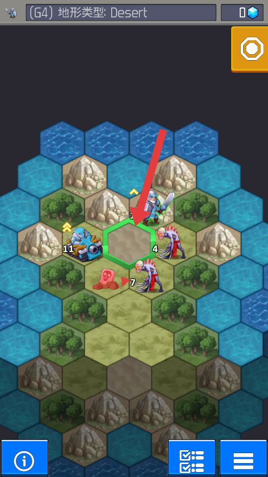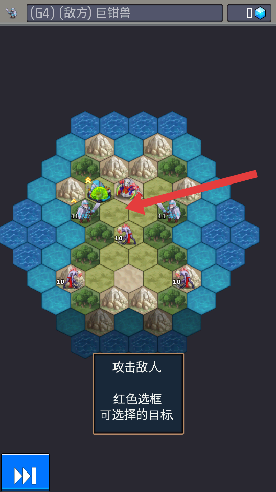 3、遇到攻击敌人时,根据红色选框可选目标,挑选合适的敌方单位进行攻击,优先攻击威胁大或能快速消灭的敌人。