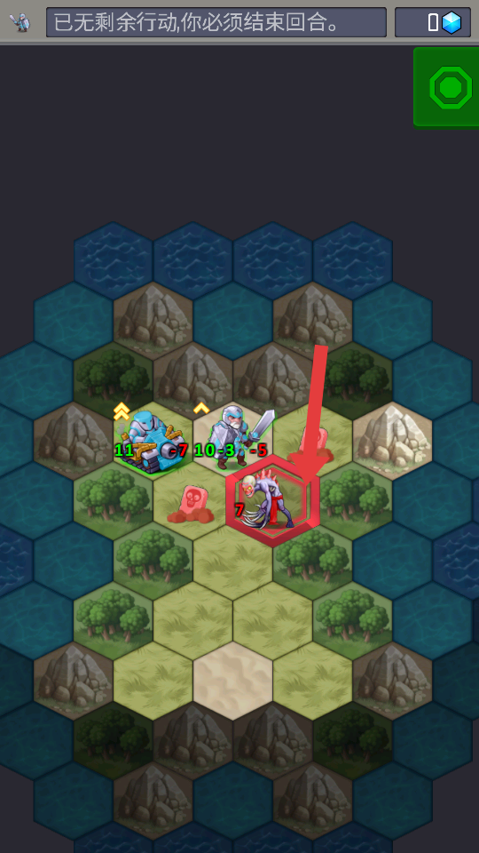 2、当界面提示已无剩余行动,你必须结束回合时,点击按钮结束回合,进入敌方行动阶段,可能的行动来调整策略。