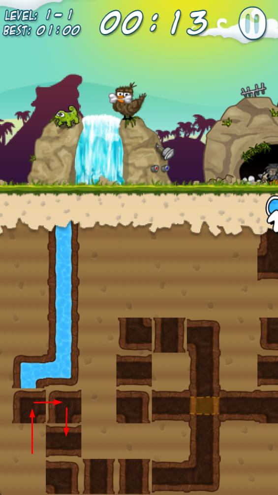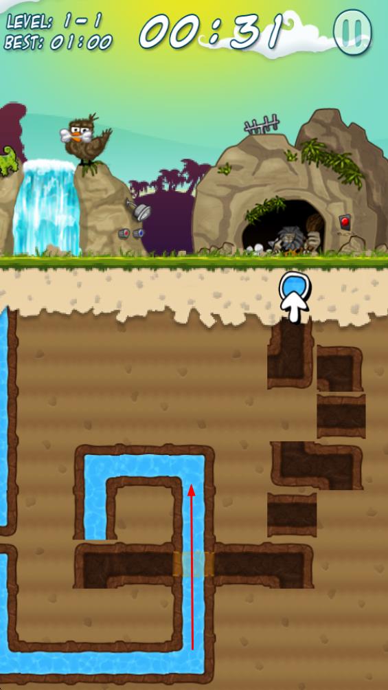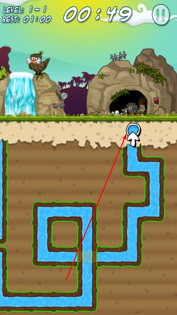 1、进入关卡如1-1、1-2,挖掘土壤开辟水渠路径,引导水源如瀑布水流流动,为后续通水打基础。