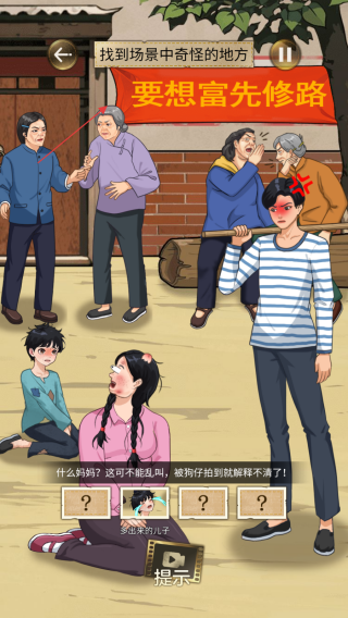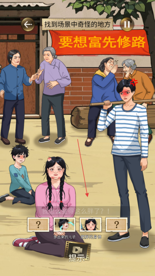 3、留意墙上要想富先修路等标语及周边环境,不放过任何细节,利用提示功能,找出所有奇怪地方通关。