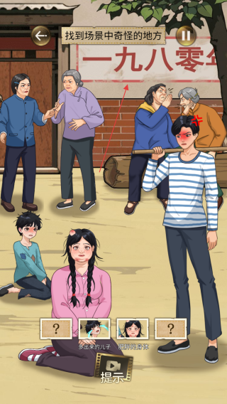 1、进入游戏根据找到场景中奇怪的地方提示,仔细观察画面,比如男人头上类似卍的红印,点击可疑处找奇怪点。
