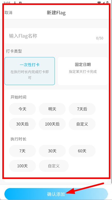 3、填写Flag名称,选择打卡类型,设置开始时间与执行时长,完成设置后点击确认添加按钮。