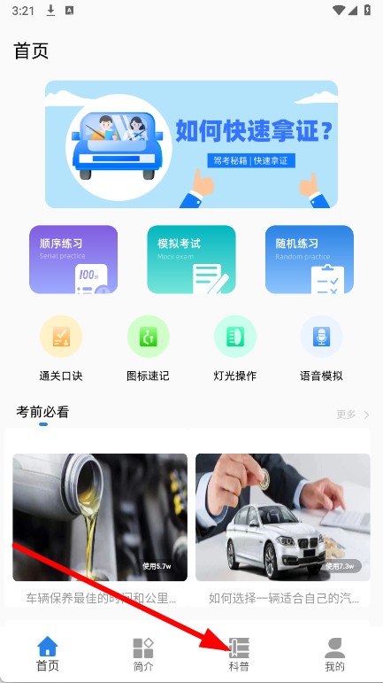 1、打开考驾照题库,点击底部导航栏的科普选项,进入科普页面。