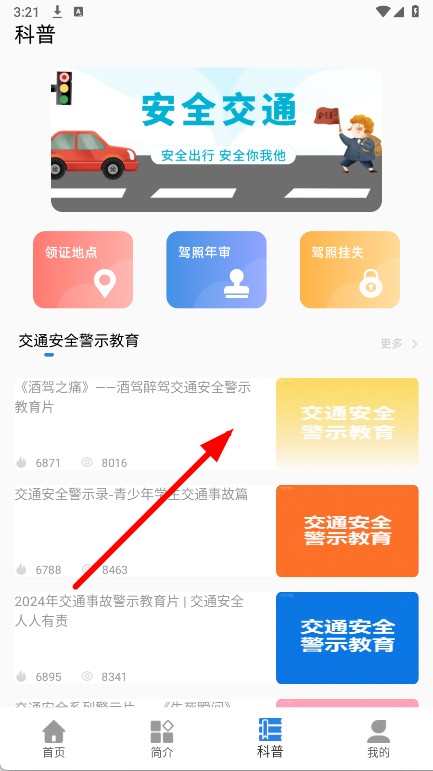 2、在科普页面的交通安全警示教育板块中,找到并点击教育片,进入视频播放界面。