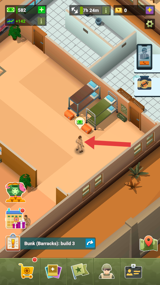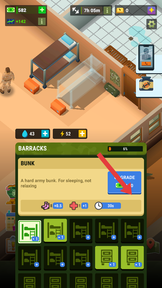 1、紧盯界面上方资源数,通过完成日常任务、升级床铺等设施提升生产力,增加绿色货币等资源获取。