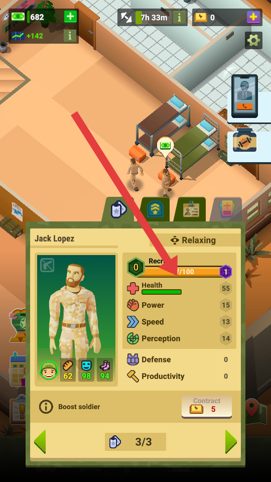 3、点开面板如Jack Lopez的面板,消耗资源提升士兵健康、力量等属性,同时积极招募士兵壮大队伍。