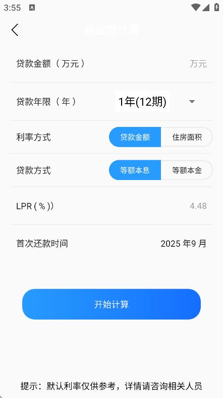 2、房贷计算操作:进入房贷计算板块,输入贷款金额、贷款期限、贷款利率等信息,选择还款方式,软件会自动算出每月还款额等详细数据。
