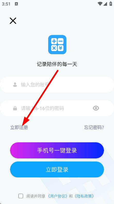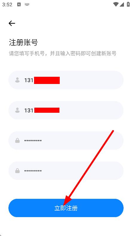 3、在注册账号页面,填写手机号和密码后,点击立即注册,完成账号注册。