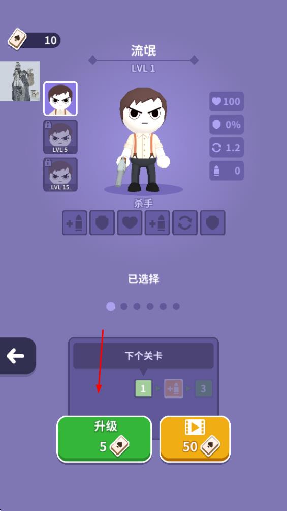 1、在角色界面,选择流氓等角色,花费对应道具进行升级,提升生命值、攻击相关属性,为战斗筑牢基础。