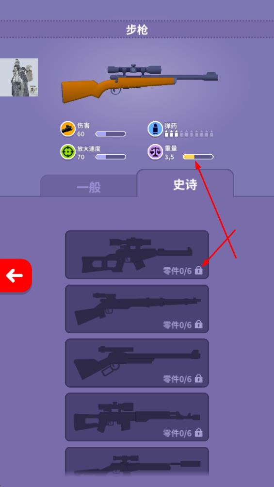 2、进入武器界面,查看步枪的伤害、放大速度等属性,收集零件解锁更高级武器,强化射击能力。
