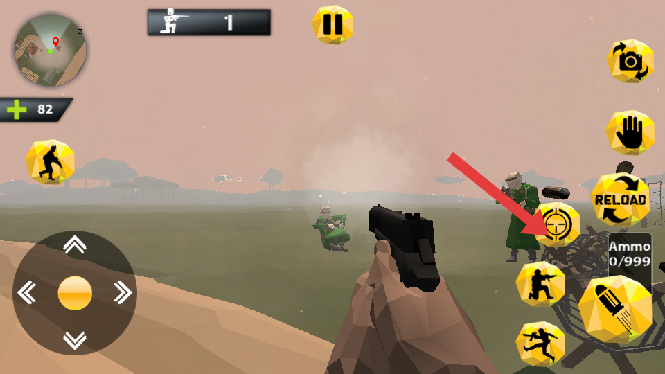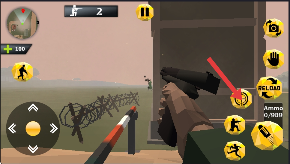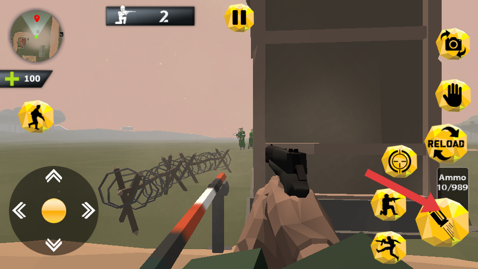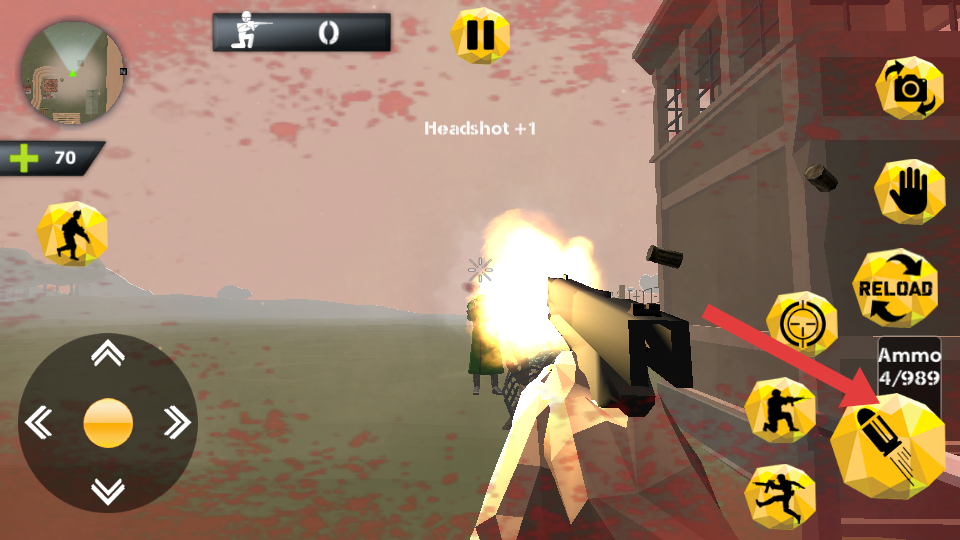 2、关注弹药量,界面显示RELOAD时,及时点击按钮换弹,在交火中因弹药不足陷入被动,同时留意生命值,寻找安全区域恢复。