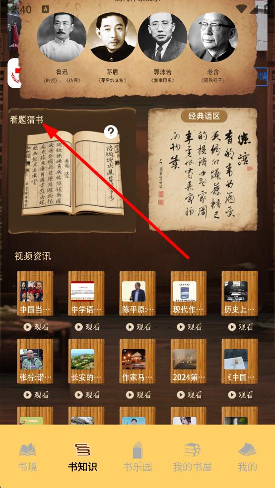 2、在书知识页面,点击看题猜书,进入看题猜书答题页面。