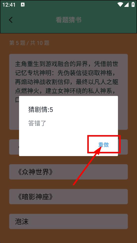 4、若答题错误,在弹出的提示框中,点击重做,可重新答题。