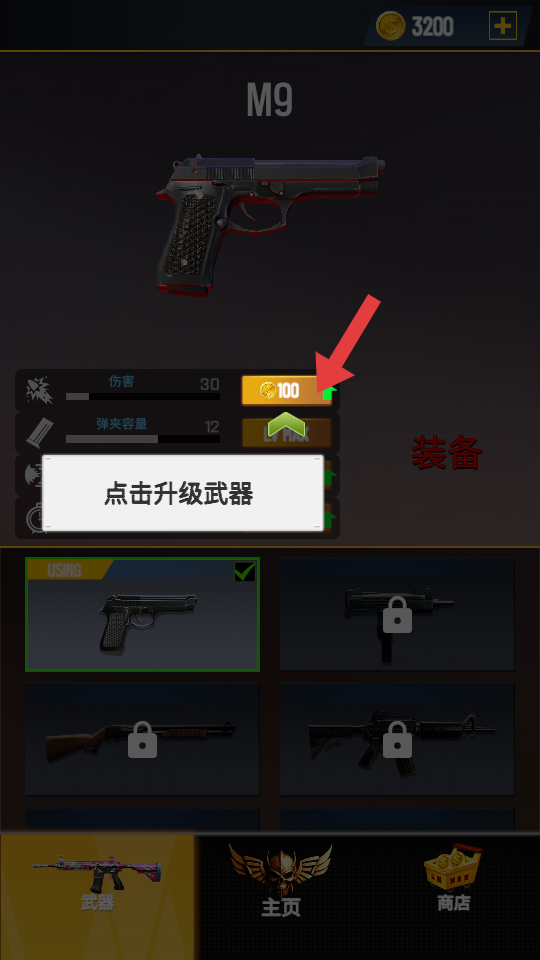 3、积累一定数量的金币后,进入商店可购买更强大的武器,点击升级武器按钮,消耗金币能对已拥有的武器进行升级。