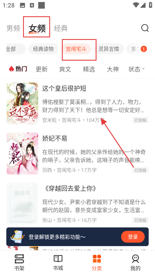 2、点击女频,选择想看的分类,查看该分类下的书籍,如这个皇后很护短,进入书籍详情页。