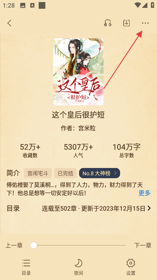 3、在书籍详情页点击屏幕唤起菜单,点击右上角的三点图标,展开更多操作选项。