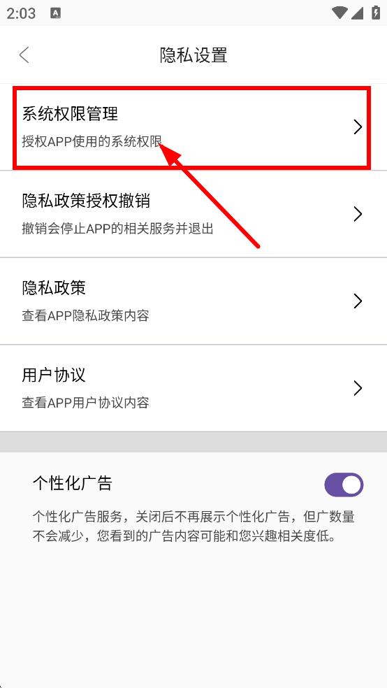 3、在隐私设置页面,点击系统权限管理,进入系统权限管理页面。